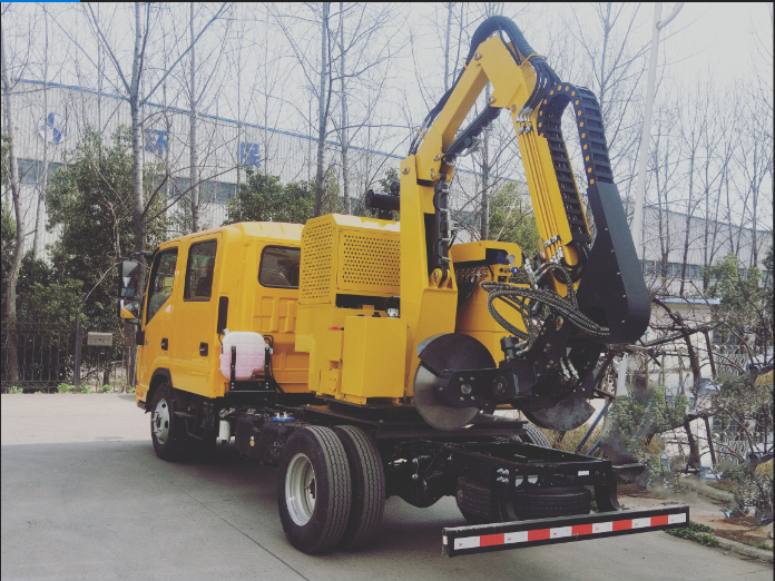 全自動三節(jié)折疊臂,一節(jié)伸縮臂,具有3個液壓油缸,底盤可在車廂板內(nèi)360°無障礙旋轉(zhuǎn),能滿足不同角度的修割,可以左右切換作業(yè)。刀盤公轉(zhuǎn)同時刀片自轉(zhuǎn)